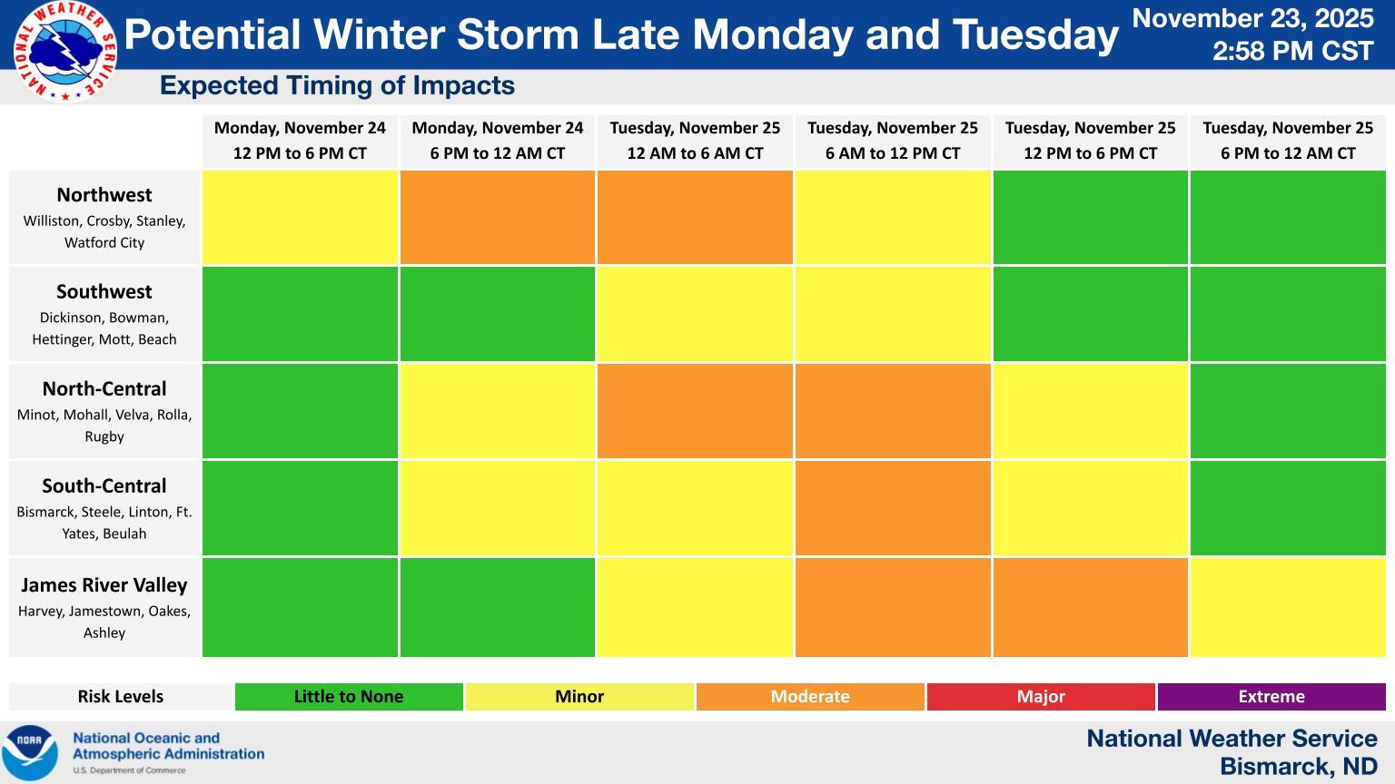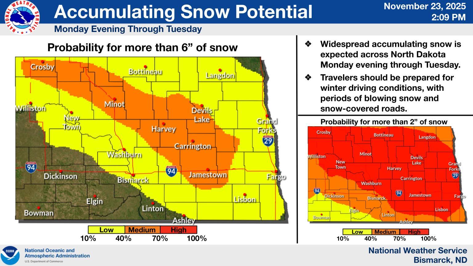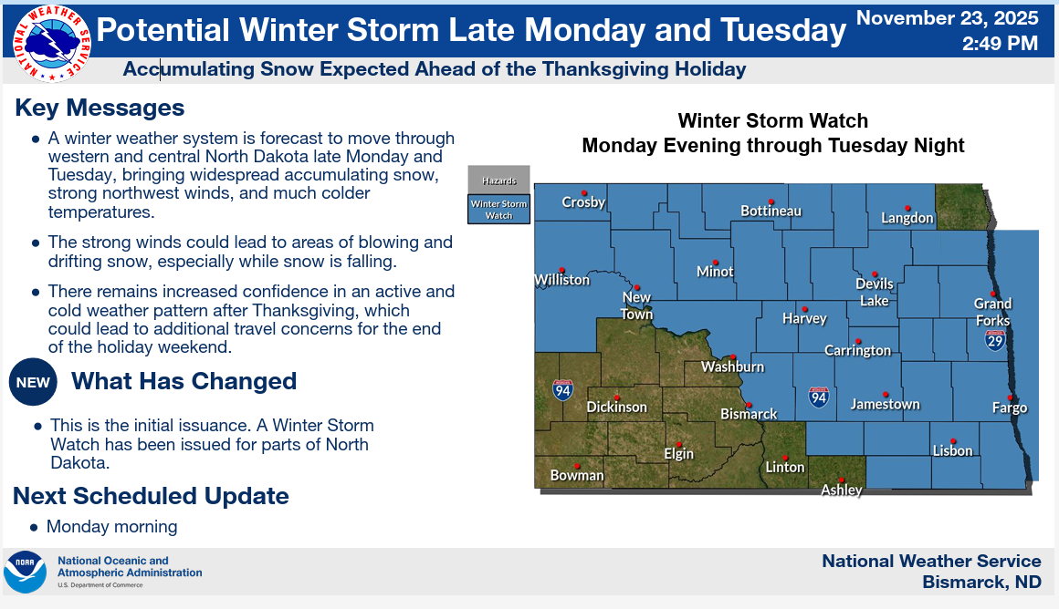 The first period of concern is Monday night into Tuesday (November 24-25), when there is a high probability of accumulating snow across western and central North Dakota. The current chance of at least 4 inches of snow is 20 to 40 percent. Strong northwest winds could also produce blowing and drifting snow.